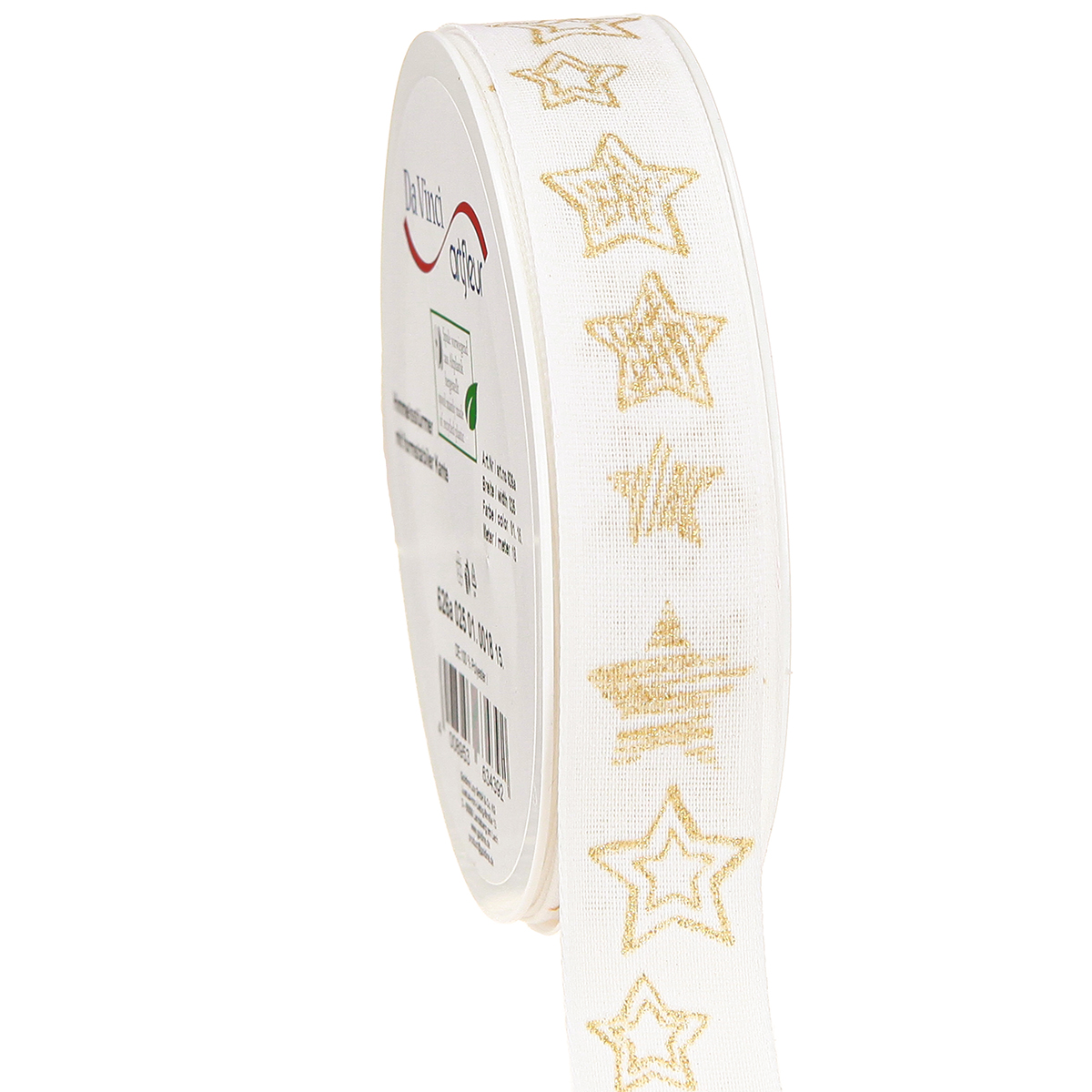 Produktname: Weihnachtsband mit Sternen-Motiv Weiß Gold 25mm 18m