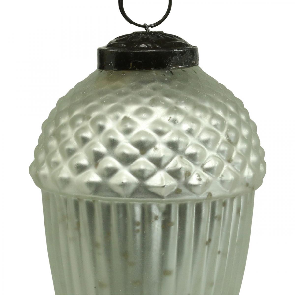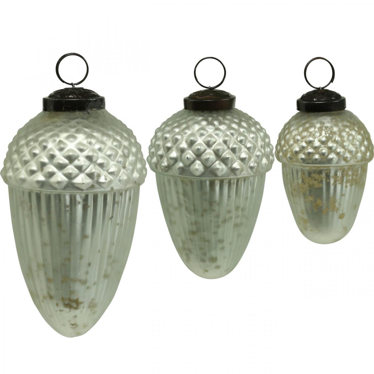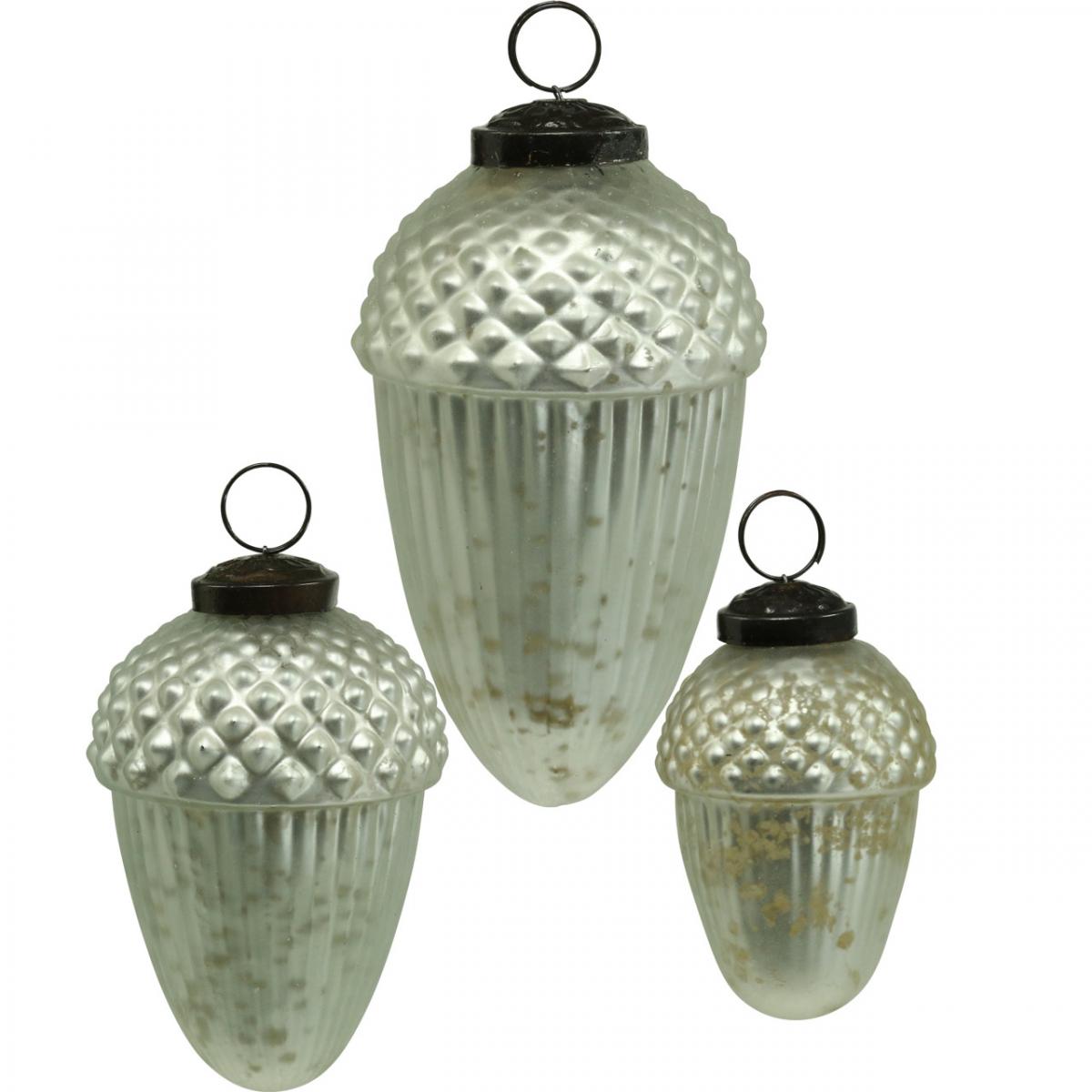 Neben klassischen Christbaumkugeln wird gerne zu Weihnachtsbaumschmuck in Form von Eicheln gegriffen. Schmücken auch Sie Ihre grüne Tanne mit diesen edlen weißen Anhängern aus Glas. Das Set besteht aus drei kunstvoll verarbeiteten Deko-Eicheln, die jeweils verschiedene Größen haben.Im Design der Weihnachtsbaumanhänger kommen moderner und Vintage-Look zusammen. Farben, Form und Details der Eichel sind stilistisch zeitgemäß umgesetzt. Die Dekohänger schimmern im matten Weiß und wirken dadurch fast schon silbern. Das Fleckenmuster wirkt wie Gebrauchs- und Alterungsspuren und erzeugt zusätzlichen Vintage-Charakter. Zum Aufhängen am Weihnachtsbaum oder zum Anbringen im Fenster bietet sich der Metallring am Kopf der Eichel an.