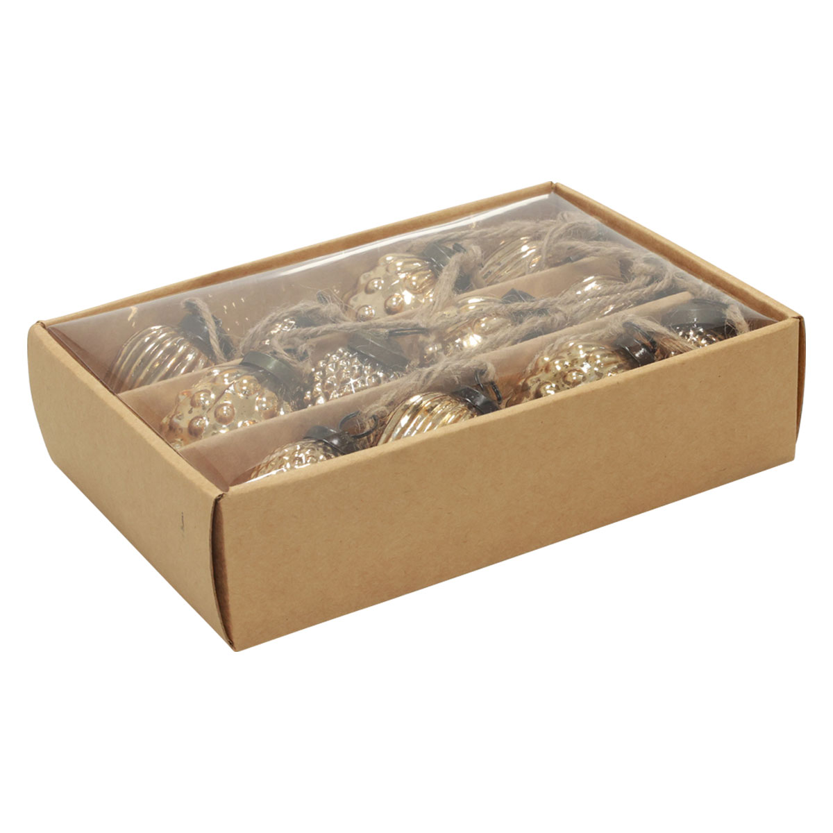 Jeder der 12 Glaszapfen in Gold hat eine Größe von ungefähr 5 bis 7 Zentimetern. Die Girlande weist in der Gesamtlänge etwa 120 Zentimeter auf.