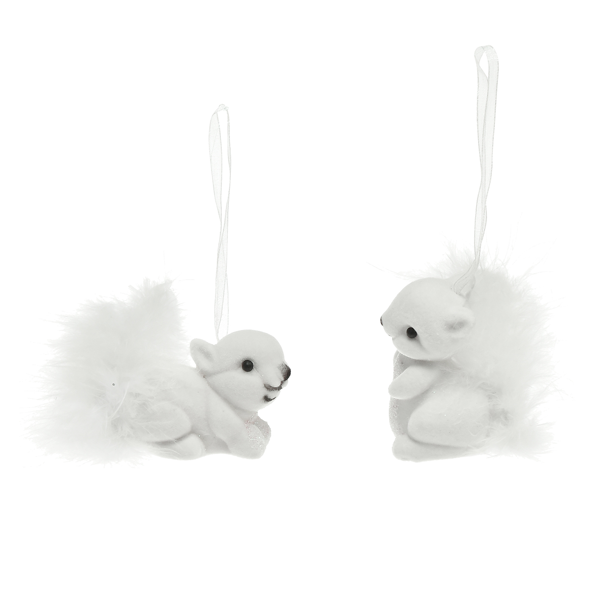 Weiße Eichhörnchen 6 cm-Anhänger mit Glitzer und Federdetail – Perfekt für festliche Weihnachtsbaumdekoration – 2St