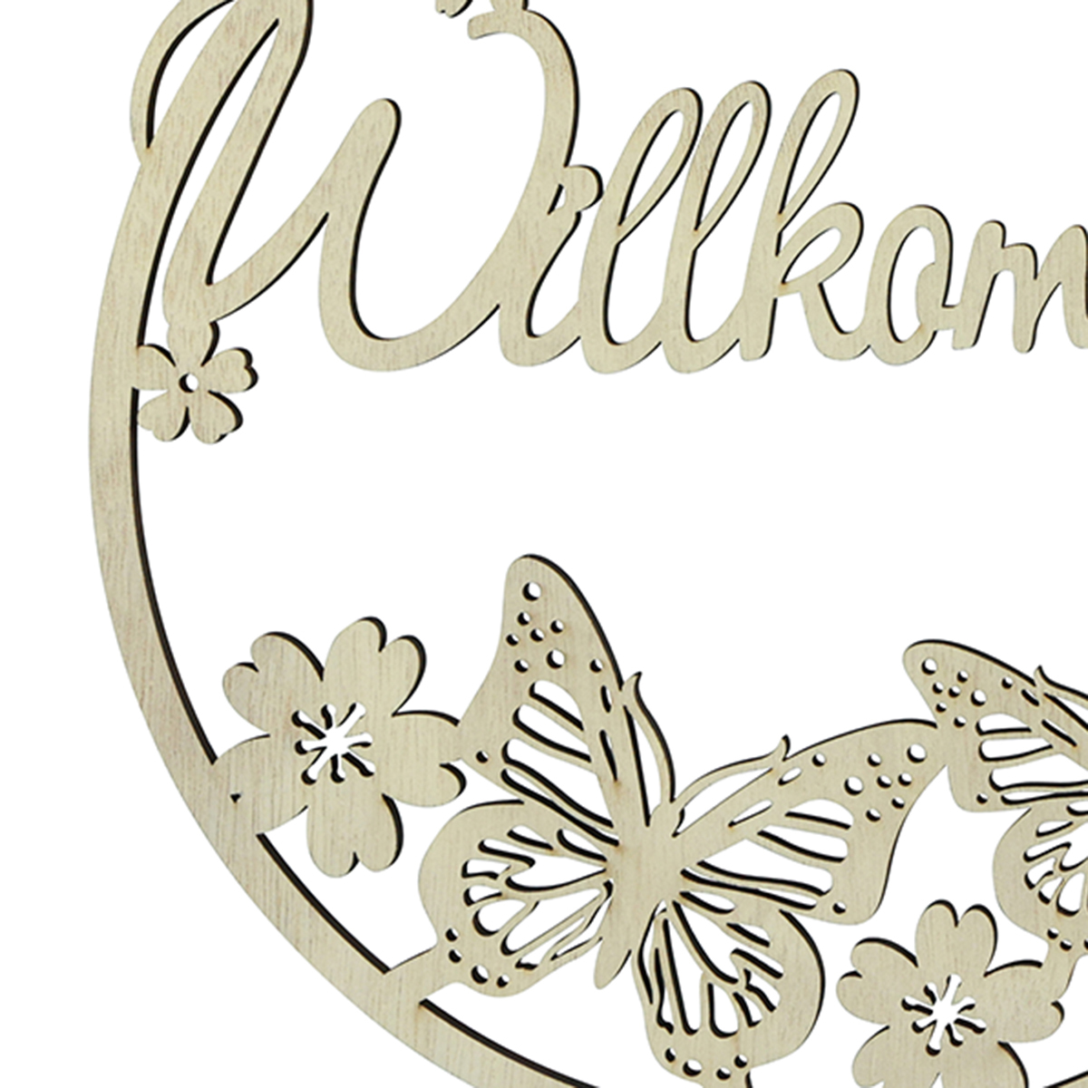 Produktname: Willkommensschild Holz Dekoring Schmetterling Ø21,5cm 4St - Türkranz Dekoration Frühling Naturfarbe