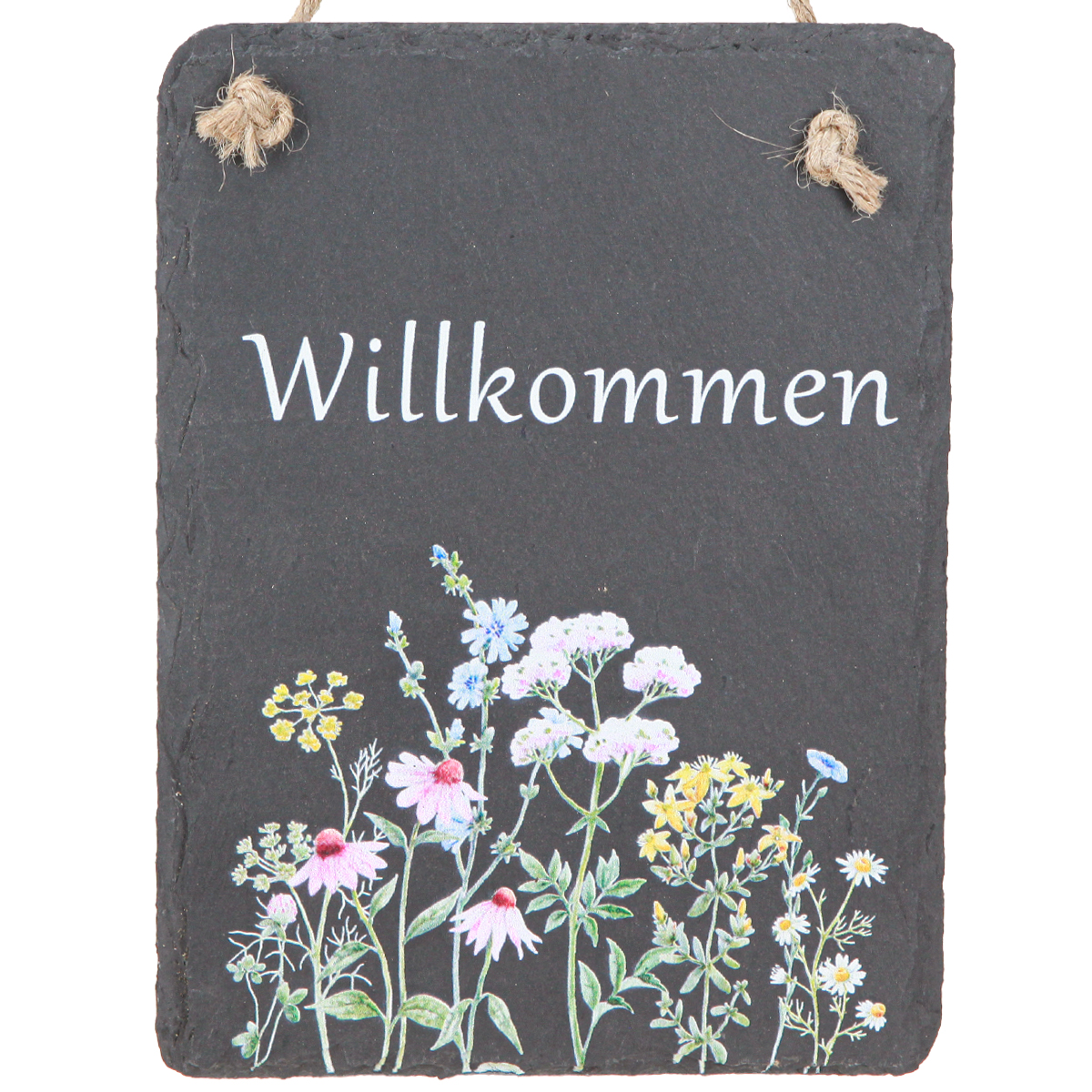 Entdecken Sie die Schönheit und Funktionalität unserer Schieferplatte, ideal als Willkommensschild für Ihr Zuhause. Diese rustikale Schieferplatte zum Hängen ist ein elegantes Accessoire, das sich wunderbar für die Dekoration Ihrer Eingangstür, Terrasse, auf Ihrem Balkon oder am Gartenhaus eignet. Mit den Maßen von etwa 20cm × 15 cm und dem Aufdruck "Willkommen" in weißer Schrift bringt dieses Schieferschild nicht nur einen Hauch von Natur in Ihr Heim, sondern auch eine freundliche Atmosphäre für Gäste. Diese vielseitige Hängedeko verleiht Ihrer Einrichtung einen Hauch von Landhaus-Charme, während die liebevoll gestalteten Blumenmotive in Rosa, Blau und Gelb einen frischen und einladenden Akzent setzen. Die robuste Jutekordel ermöglicht müheloses Aufhängen, wodurch das Schild sowohl an Türen als auch an Fenstern eine gute Figur macht. Verleihen Sie Ihrer Frühlings- und Sommerdekoration das gewisse Etwas mit diesem einzigartigen Stück, das Wärme und Willkommen ausstrahlt.