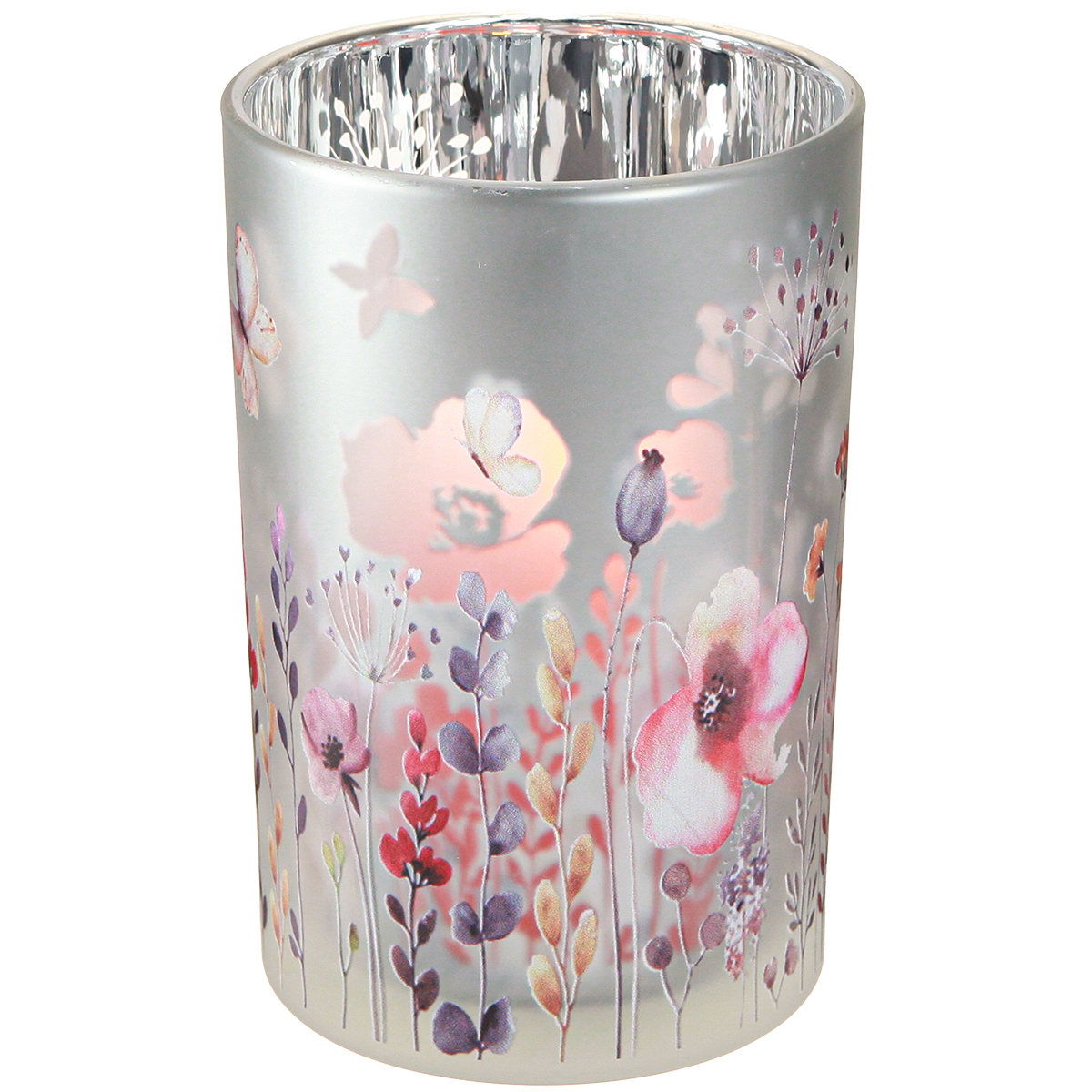Windlicht aus Glas Mohn Schmetterling Silber Farbe H18cm