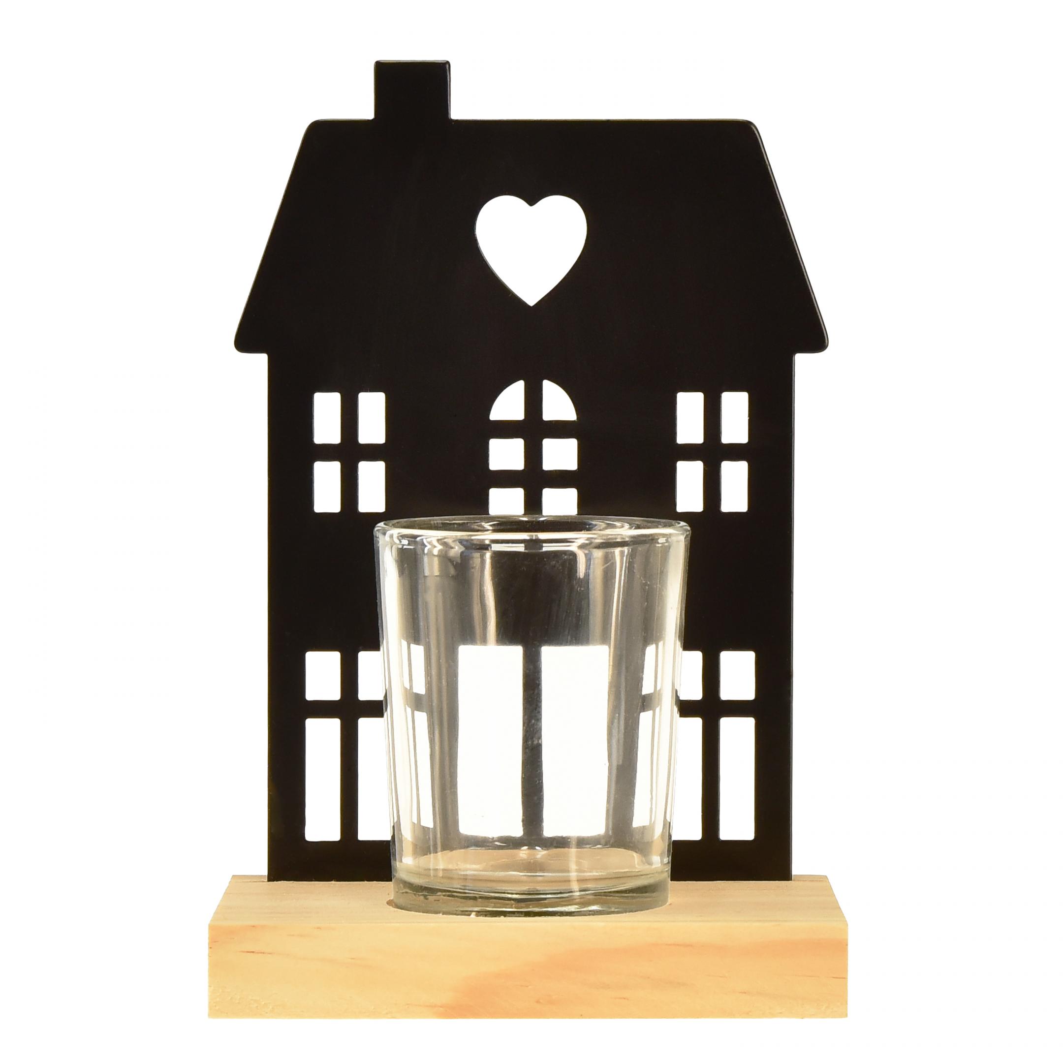 Windlicht Haus Metall Schwarz mit Holz Sockel H15cm 2St