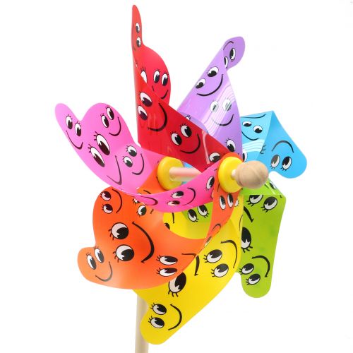 Gestalten Sie mit dieser Windmühle eine farbenfrohe, kunterbunte Sommerdeko, die besonders Kinderaugen zum Strahlen bringen wird! Das lustige Windspiel besteht aus einem sehr stabilen Holzstab, an dem oben Kunststoffblätter angebracht sind, die sich bereits herrlich drehen, wenn ein Windhauch sie erreicht. Dabei trumpft das Dekowindrad vor allem mit seinen bunten Farben und den lustigen Gesichtern, bestehend aus Augen und einem lächelndem Mund. Wer kann bei diesem Anblick schon ernst bleiben?Ob als fröhliche Gartendeko für den Kindergarten oder eine Geburtstagsparty, die Windmühle versprüht über all Gute Laune! Stecken Sie dafür den Holzstab einfach in Blumenerde eines Gartenbeetes, in Pflanzkübel oder Blumentöpfe und schon kann der Spaß beginnen. Da muss noch nicht einmal der Wind stark blasen, denn Dekowindspiele wie diese sehen auch bei Windstille einfach nur bezaubernd aus!