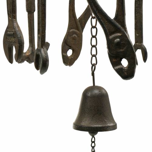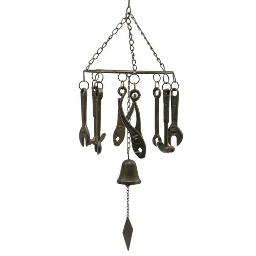 Das Windspiel zum Hängen mit Werkzeug besteht aus Metall und hat mit der Kette eine Gesamtlänge von etwa 66 Zentimetern, wobei die Hänger zwischen etwa 18 und 43 Zentimetern lang sind. Der Metallring, an dem die Utensilien hängen, hat einen Durchmesser von circa 21 Zentimetern.