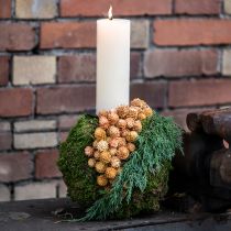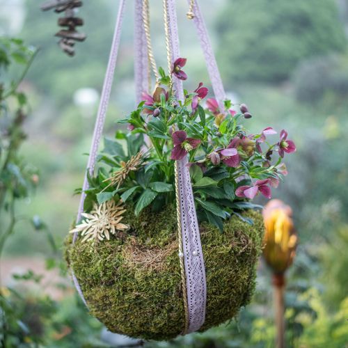 Die Christrosen werden mit Moos, Weihnachtsdeko aus Stroh und einem Spitzenband zum schwebenden Blickfang. Die Kälte überstehen die Blumen in dieser Weihnachtsdeko außen überraschend gut. Das Einfrieren der Christrosen solltet ihr trotzdem vermeiden Für zusätzlichen Frostschutz könnt ihr auch eine Schicht Kokosfaser unter dem Moos eures Kokedama einplanen.