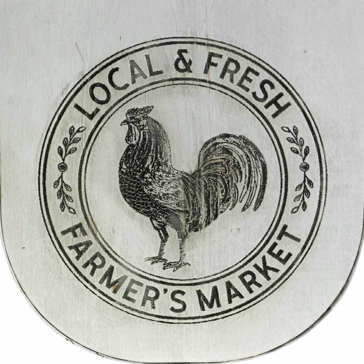 Der Zeitungskorb besteht aus einem gebogenen Metallgitter und wird an den Seiten von zwei Holzscheiben zusammengehalten. Diese sind wiederum mit einem Holzstab verbunden, der als Tragegriff dient. Der Aufbewahrungskorb wurde weiß bemalt und trägt im Stil des Shabby Chic bereits leichte Gebrauchsspuren. Als stimmige Verzierung sind auf beiden Seiten des Zeitungshalters ein rundes Logo mit Hahn und Aufschrift zu sehen.