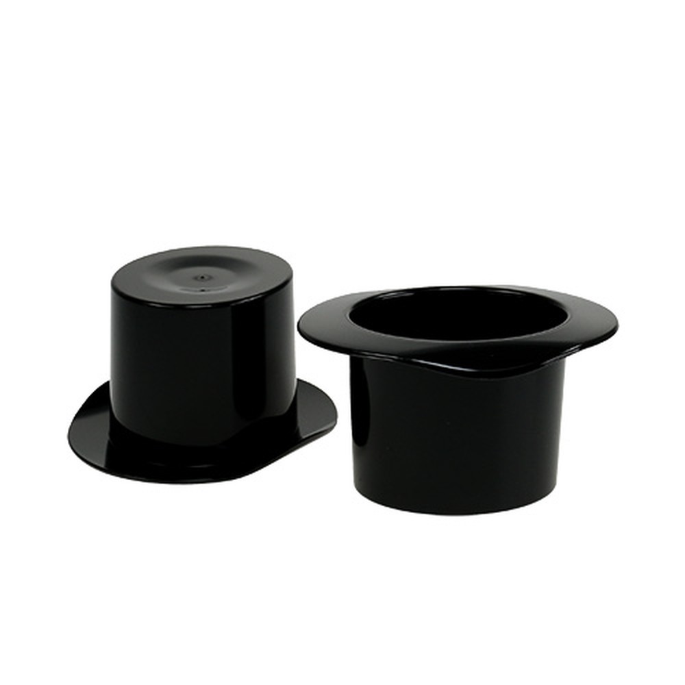 Geliefert werden die schwarzen Zylinder aus Kunststoff in einem Set zu insgesamt 9 Stück. Jeder Hut ist in etwa 9 Zentimeter hoch und besitzt eine ungefähr 8 x 7 Zentimeter große Stellfläche. Die Innenmaße betragen circa 7,5 x 6,5 Zentimeter, während die Außenmaße bei etwa 12 x 10 Zentimetern liegen.